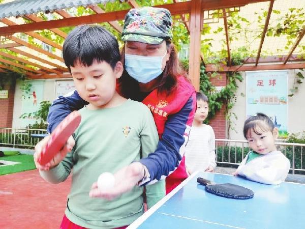 在文明城市創建活動中,啟民義工組織志愿者走進市新華南路小學,配合開展課后延 時志愿服務活動,不斷滿足學生綜合素質發展需求,促進學生的全面發展。圖為志愿者教學 生打乒乓球技巧。(張鑫 王峰攝)