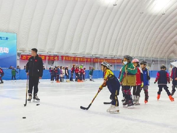 當(dāng)天的活動(dòng)中,來(lái)自我市逸夫小學(xué)、馬路街小學(xué)等22所中小學(xué)的110余名學(xué)生參與了冰上趣味活動(dòng)。“小運(yùn)動(dòng)員們”穿上專業(yè)裝備,站立在冰面上,手持冰球桿,在教練的指導(dǎo)下學(xué)習(xí)使用球桿,完成擊球、射門等動(dòng)作。隨后進(jìn)行的冰上障礙接力中,每個(gè)團(tuán)隊(duì)派出4名隊(duì)員參加,大家你追我趕、奮力接力,吶喊聲和加油聲此起彼伏。