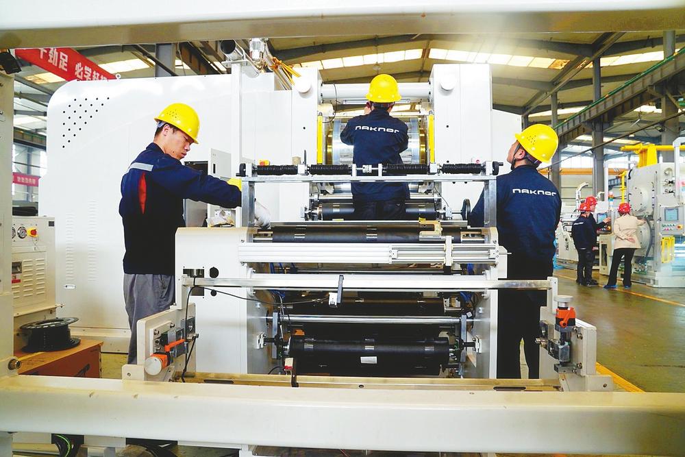位于市經開區的邢臺納科諾爾精軋科技股份有限公司總裝車間,工作人員正在調試輥壓機。(資料片)