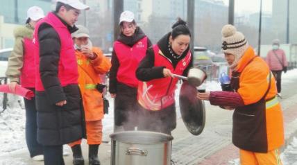 12月18日,在團市委和信都區文明辦組織下,信襄公益協會聯合愛心企業在市區開展“環衛暖城青春暖邢”志愿活動,為依然戰斗在清雪一線的環衛工人送去紅糖姜茶和暖心關愛。 (邢臺新聞傳媒中心記者 劉曉燕 通訊員 田葉龍 攝)
