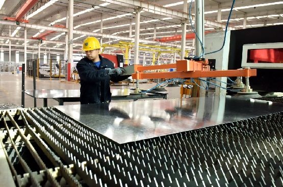 ↑3月11日,工人在威縣高新區的一家電力設備有限公司生產線上工作。
