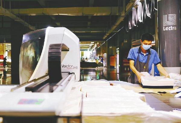 近日,在寧晉縣童泰嬰幼兒服飾有限公司的裁剪車間,工人在整理自動化裁床裁剪的布料。