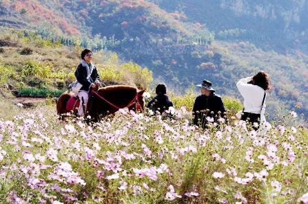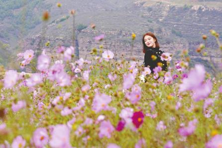 近日,游客在沙河市王硇村的梯田里賞花游玩。
