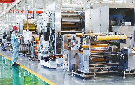 近日,工人在海裕鋰能電池設備有限公司調(diào)試電池極片輥壓機。
