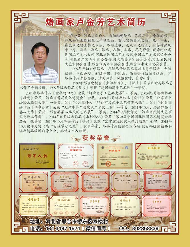 盧金芳自幼癡迷繪畫,興趣廣泛。中學時代,他有幸師從天津著名書畫家王連桂先生,打下了扎實的美術功底。數十年來,他在藝術道路上從未停歇,廣納百家之長,將多種畫風融會貫通,不僅精于烙畫,在國畫、油畫領域亦造詣深厚,人物、山水、花鳥等題材皆能信手拈來。如今,他身兼中國工藝美術家協會會員、河北省民間工藝美術大師、邢臺市信都區民間文藝家協會副主席等十余項殊榮,每一份榮譽都是對其藝術成就的最佳佐證。